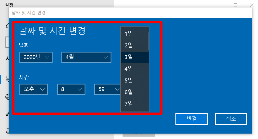 위에서 날짜로 달과 일을 선택하시고 시간으로 오전/오후와 시/분을 지정해주시고 변경을 눌러주시면 됩니다. 윈도우 우측 하단 작업표시줄을 보시면 설정한 시간으로 바뀌었음을 볼 수 있을 겁니다. 그렇다면 현재 잘못된 시간을 다시 되돌리는 방법은 무엇일까 궁금하실 겁니다.