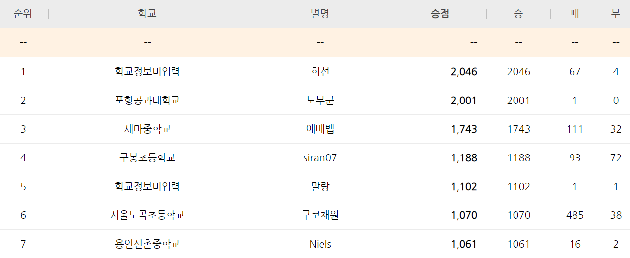 이렇게 모든 게임은 한컴타자 연습 온라인 사이트의 게임랭킹 메뉴를 들어가보시면 보입니다. 고순위를 보시면 역시나 승리가 많고 패배가 적은데 저정도가 되려면 최소 타자가 600타정도는 되야한다고 봅니다. 학교와 별명으로 내가 다니고 있는 학교를 홍보하고 자랑할 수 있기 때문에 대항전이라는 측면으로도 초중생들이 많이 하는 것 같습니다.