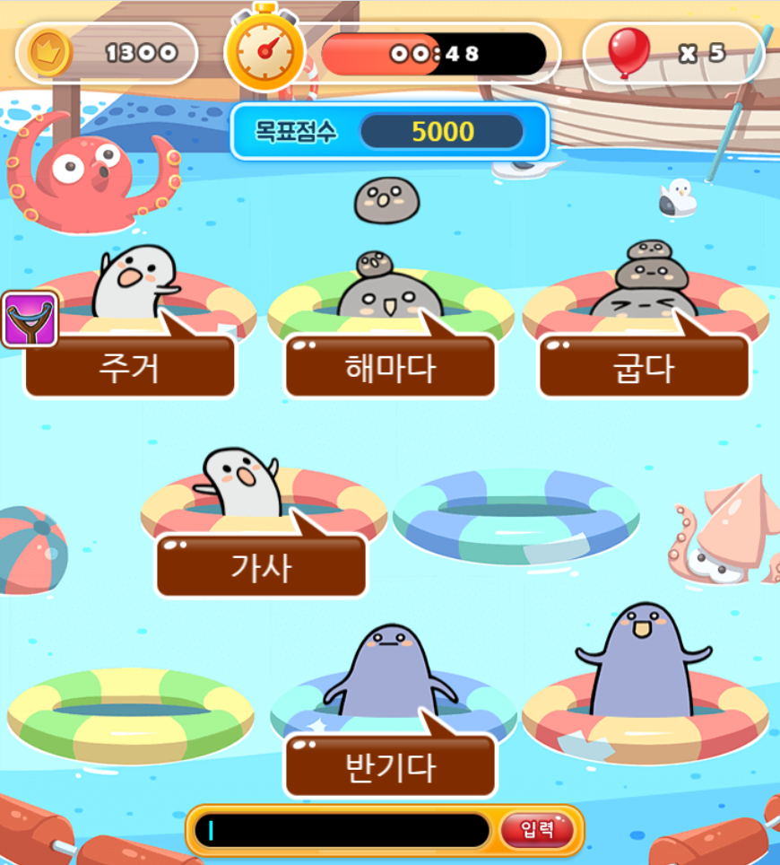 저의 최애게임인 두더지잡기입니다. 9개의 구멍에서 갑작스럽게 두더지들이 튀어나오는데 정확한 단어를 입력해주셔야만 두더지를 때려서 다시 내려보낼 수 있습니다. 두더지를 떄릴수록 점수가 오르게 되고 이 점수는 사이트의 랭킹에 기록될 수 있습니다. 저도 1등을 하기 위해서 자주 하고 있는데 최대가본 랭킹이 7위였습니다. 상당히 재미있으니 한번 해보시는 것을 추천하고 싶습니다.