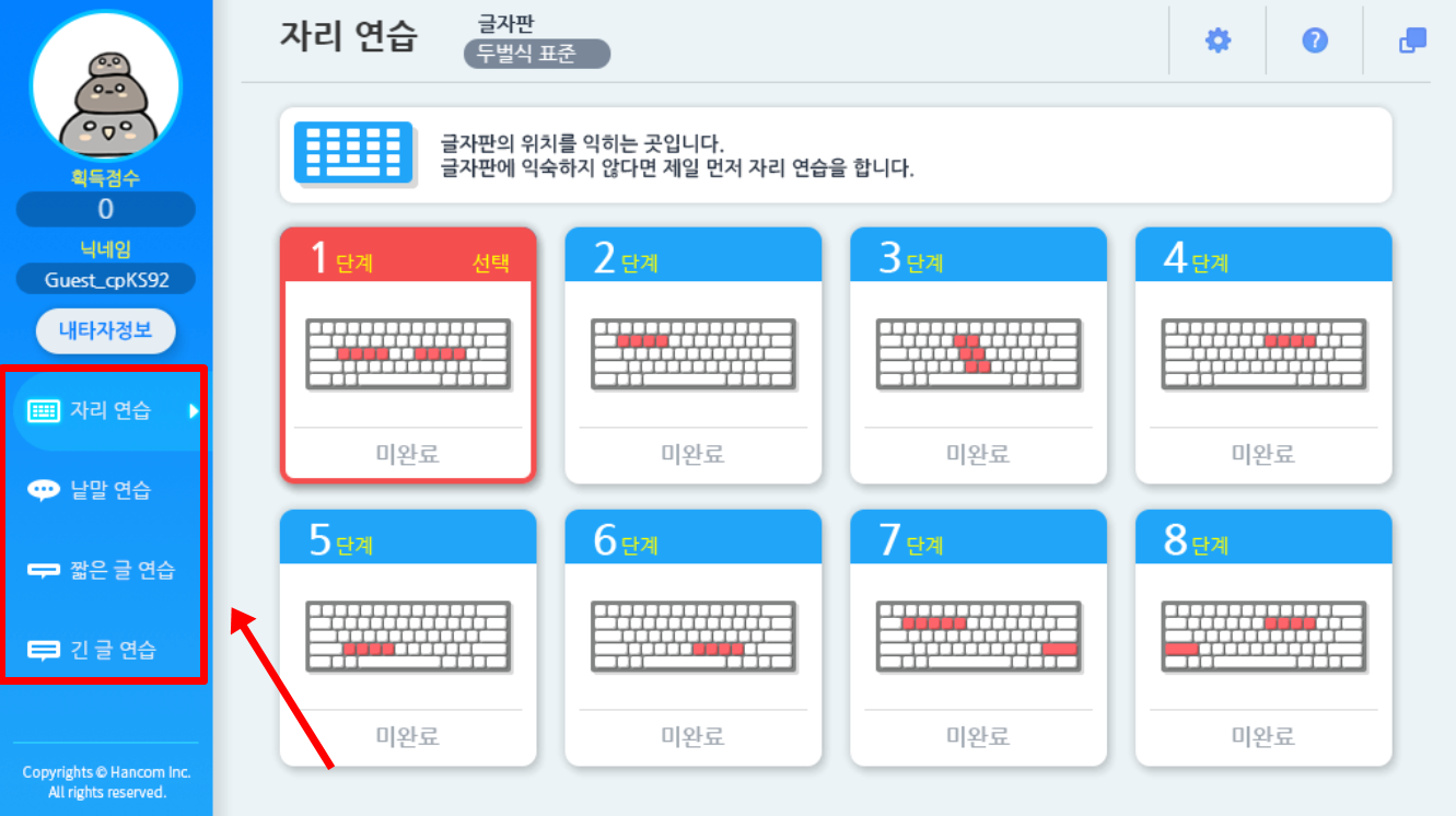 가장 기초중의 기초부터 배우고 싶다면 자리연습을 먼저 하셔야 합니다. 저도 최근 이것을 하고 있는데 이것이 왜중요하냐면 무슨키를 무슨 손가락으로 눌러야되는지 정확한 운지법을 알려주기 때문에 착실히 배우신 뒤 다른 연습 메뉴를 이용하시는 것이 좋습니다. 왜냐하면 내 멋대로 더 빠르고 편리하다고 자주 사용하는 손만 사용하면 운지법이 틀려지게 되고 나중에는 손가락 관절에 무리가 와서 저처럼 마사지 찜질을 받아야될 수 있으니까요. 익숙해질 때까지 연습을 해주셨다면 오른쪽에서 다른 난이도 메뉴를 클릭해서 이동하실 수 있습니다.