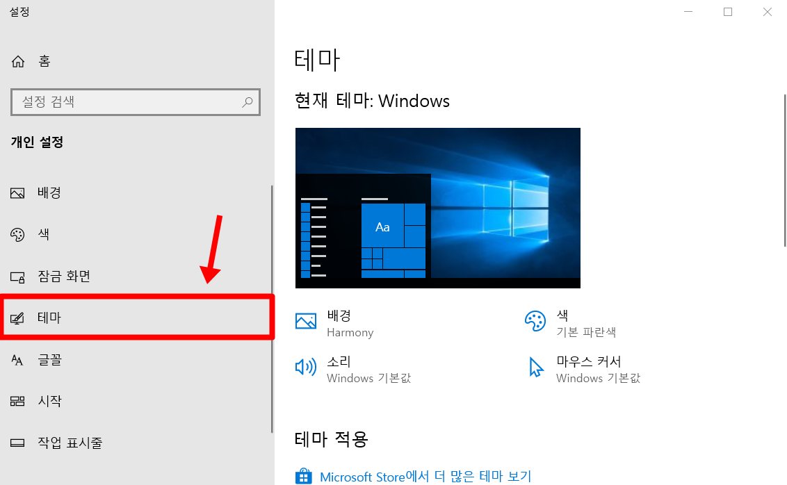 좌측에서 테마 메뉴를 눌러주고 아래로 내려줍시다. 참고로 여기서 나의 컴퓨터 바탕화면의 배경사진이나 색등을 바꿀수도 있습니다. 자신만의 커스터마이징으로 꾸밀 수 있는 메뉴입니다.