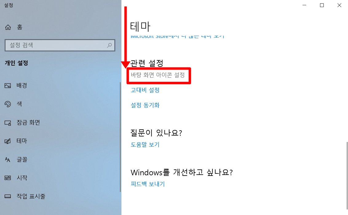 관련 설정 바로 아래에 바탕화면 아이콘 설정 메뉴가 있습니다. 클릭해줍시다.