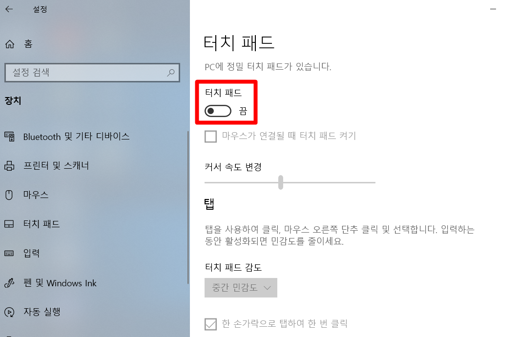 반대로 끔을 눌러서 켬을 눌러주면 터치패드 잠금이 해제 됩니다. 이렇게 되면 마우스와 함께 이용을 할 수 있습니다. 단 마우스가 없는 상태에서 설정을 들어가는 것은 불가능하기 때문에 패드가 잠겨있는 상태라면 맨처음에 설명드린 자판 설정을 하셔야 합니다.