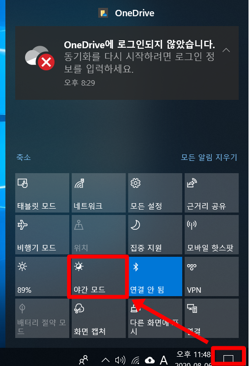 6. 언제든지 윈도우10 야간모드를 ON/OFF 하고 싶으시다면 컴퓨터 최우측 하단의 메뉴바를 클릭하신 다음 야간모드 버튼을 클릭하셔서 키고 끄실 수 있습니다.