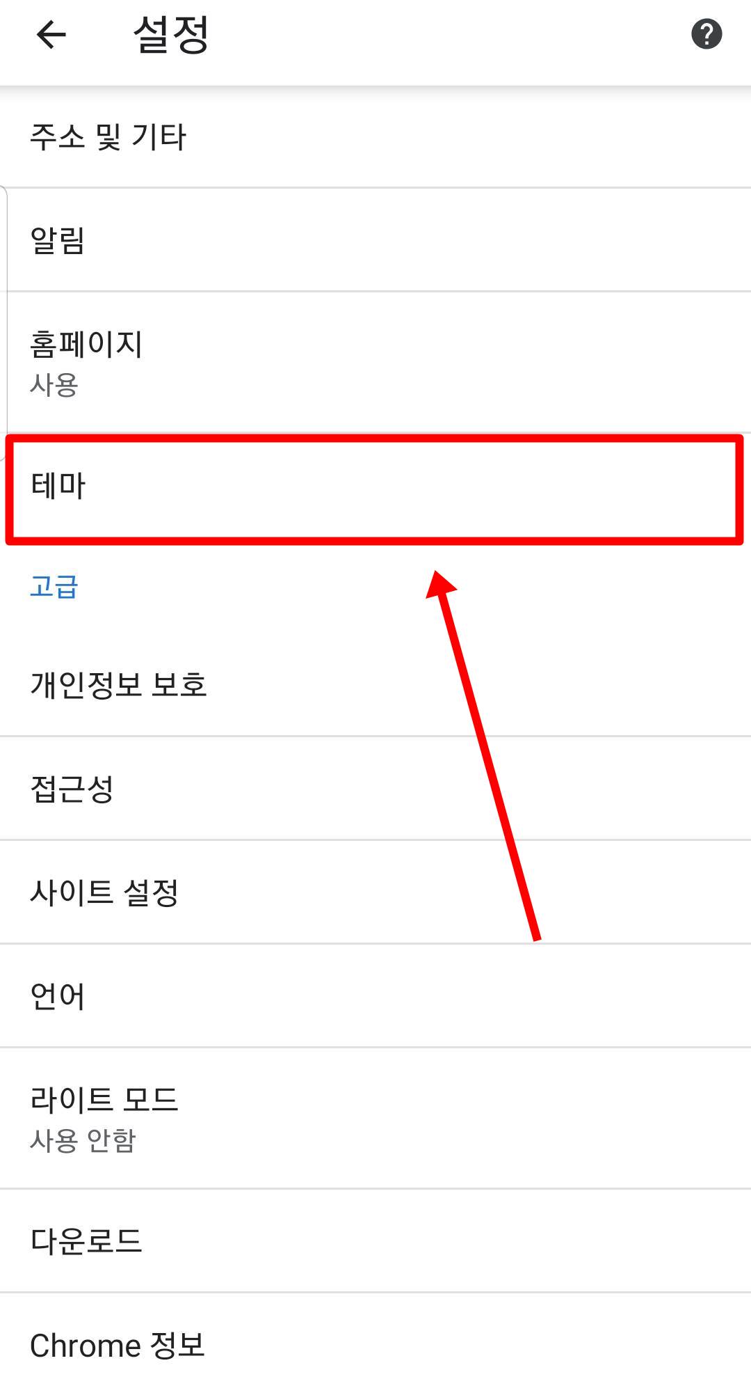 2. 테마를 누르시고 어둡게를 선택하시면 스마트폰 크롬 다크모드가 설정됩니다. 다시 설정을 돌리고 싶으실 때는 밝게 또는 시스템 기본값을 선택하면 됩니다.