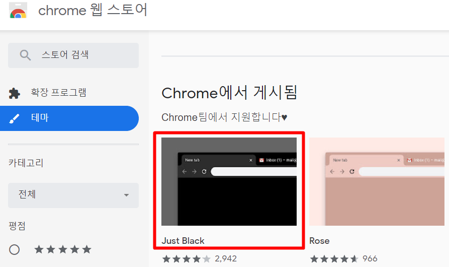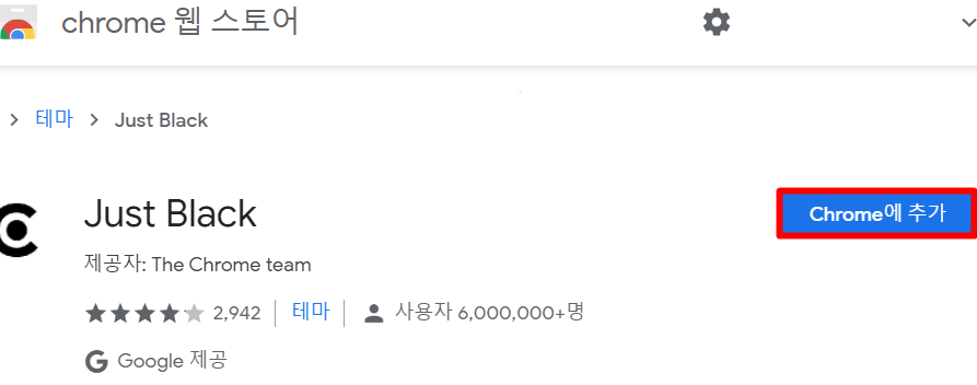 3. 바로 화면에서 Chrime 팀에서 지원하는 Just Black을 눌러주시면 됩니다. Just Black은 크롬 다크모드이며 그 외에도 빨간색, 초록색, 노란색 등 다양한 테마들이 준비되어 있으니 마음에 드시는 것을 고르셔도 됩니다.