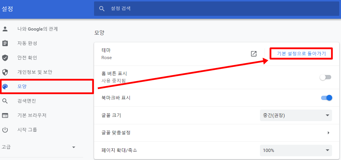 5. 테마를 변경하거나 다시 원상복구하고 싶으시다면 ...메뉴 > 설정 > 모양 > 기본 설정으로 돌아가기를 순서대로 클릭하시면 됩니다.