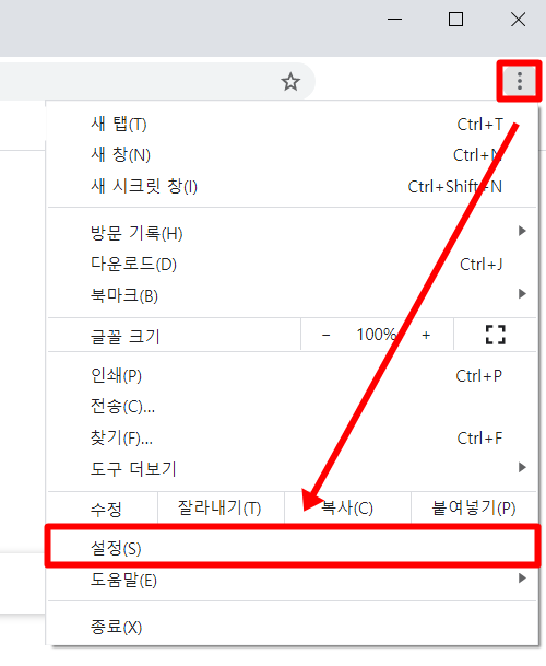 1. 컴퓨터에서 크롬 웹사이트를 켜주시고 우측 상단 ... 버튼 메뉴를 클릭해주신 후에 설정(S)를 누르시길 바랍니다.